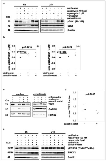 The activity of TFEB and the FOXO family members FOXO3a and FOXO1 is regulated by phosphorylation, such that they only locate to the nucleus and activate target genes transcription in an unphosphorylated state. Conversely, phosphorylation via ERK2 and mTORC1 (TFEB) or via the PI3K-AKT pathway (FOXO) causes their retention in the cytoplasm [18,19]. Neither treatment with vorinostat nor panobinostat affected nuclear translocation of TFEB in SK-B-BE(2)-C cells (Figure 3c,d; Supplementary Figure S3a). Moreover, neither vorinostat nor panobinostat treatment affected ERK phosphorylation in SK-N-BE(2)-C cells (Figure 3e; Supplementary Figure S3b).