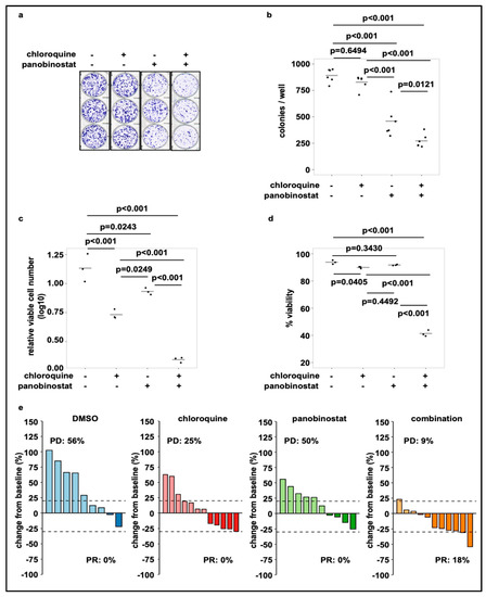 HDACi mediated induction of autophagy has been linked to therapeutic resistance to HDACi treatment [37] and could be disrupted by combining HDACi with autophagy inhibitors, such as chloroquine. Additionally, cell death induction by HDACi treatment was enhanced by combination treatment with autophagy inhibiting drugs [38,39]. To investigate the interplay of autophagic flux inducing broad-spectrum HDAC inhibitors with autophagy inhibiting drugs in our neuroblastoma cell model, we performed neuroblastoma colony assays. Co-treatment of SK-N-BE(2)-C cells with chloroquine and panobinostat effectively reduced colony formation (Figure 5a,b). In line with blocked colony formation, the number of viable cells (Figure 5c) and cell viability (Figure 5d) were substantially reduced by combination treatment with chloroquine and panobinostat, indicating a beneficial effect of the combination. To investigate treatment efficacy in vivo we used a zebrafish embryo/early larvae SK-N-BE(2)-C xenograft model. We tested panobinostat and chloroquine alone and in combination. Data are depicted as waterfall plots illustrating the change in tumor volume over baseline for the individual fish larvae (Figure 5d). Treatment with the combination of chloroquine and panobinostat substantially improved the response rate (PR = partial response according to RECIST, adopted for zebrafish) [25] with 0% PR for panobinostat or chloroquine alone and 18% for the combination. The progression rate (PD = progressive disease) decreased from 25% (chloroquine) and 50% (panobinostat) for the single treatment to 9% for the combination (Figure 5d).