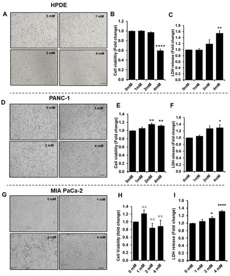 HPDE, PANC-1, and MIA PaCa-2 cells treated with glyceraldehyde for 48 h. (A,D,G) Bright field images of cells treated for 48 h with glyceraldehyde. Scale bar: 200 µm. (B,E,H) Cell viability determined by MTT assay. (C,F,I) Cell damage determined by LDH assay. Absorbance or fluorescence values were normalized to control (0 µM). Data represent the mean (n = 3) ± SE. N.S, not significant, **** p < 0.0001, ** p < 0.01, * p < 0.05 vs. control (0 mM).