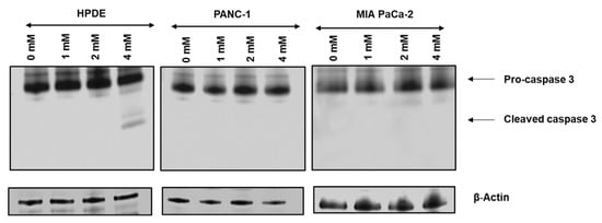 Western blot analysis of cleaved caspase-3 in HPDE, PANC-1, and MIA PaCa-2 cells treated with glyceraldehyde. Western blot was performed for three independent experiments for each cell type.