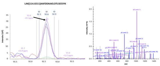 Elution profile and spectral identification of a K-glycated AGE peptide identified by high-resolution mass spectrometry.