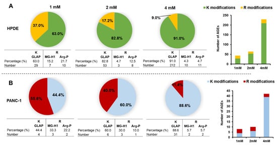 The proteomic data in our study revealed a larger number of protein AGE adducts in HPDE cells compared to PANC-1 cells. This is consistent with our cellular experiments, in which we observed that HPDE cells were more vulnerable with glyceraldehyde treatment compared to PANC-1. Glyoxalase 1 is an enzyme which detoxifies the methylglyoxal (MG) precursor of AGEs [54,55,56]. This enzyme is highly expressed in tumors and cancerous tissues compared to healthy tissues [57,58]. Our results confirmed that PANC-1 cells have less AGEs accumulation compared to normal HPDE cells, possibly due to higher expression of glyoxalase 1. Additionally, an increased production of MG is responsible for RAGE signaling and oxidative stress [59], suggesting that HPDE cells were more vulnerable to intracellular AGE accumulation. The proteomic data further indicated that lysine glycations were concurrently increased with the glyceraldehyde concentrations, whereas the dose effect on arginine glycations was negligible (Figure 6). It has been reported that the occurrence of glyceraldehyde- and glyoxal-derived lysine glycations are higher than arginine glycations in serum albumin and mouse collagen [60,61]. Furthermore, lysine-based AGEs, such as CML, have shown to be involved in the biology of cancers by activating transcription factor NF-kB [62] and upregulating VEGF [63] to promote angiogenesis and induce DNA damage [64], leading to cancer progression. Our observation demonstrated the notion that lysine was more liable to a dose-dependent AGE modification, likely due to the nature of its chemical structure. The surrounding amino acids are in a hydrophobic and acidic environment, which is likely to be important in determining the glycation site [65]. This observation, if further validated, might have an important implication in developing novel strategies in reducing the formation and accumulation of toxic AGEs in cancer prevention.