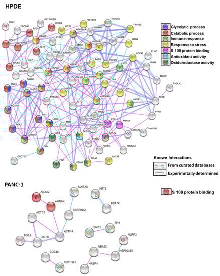 Molecular functions in GO analysis (Figures S3 and S4) showed that AGE-modified proteins (Tables S6 and S7) in both HPDE and PANC-1 cells are involved in S100 protein binding. Three glycated proteins belonging to this groups were Annexin A2, Neuroblast differentiation-associated protein AHNAK, and Ezrin. Annexin A2 and AHNAK proteins were glycated in both HPDE and PANC-1 cells, while Ezrin was only found to be glycated in HPDE cells. Besides S 100 protein binding, glycated proteins of HPDE cells are involved in additional networks that are cancer relevant, including immune response, glycolytic process, catabolic process, response to stress, antioxidant, and oxidoreductase activity (Table S8). Furthermore, pathway analyses showed that the glycated proteins were involved in glycolysis carbon metabolism, proteoglycans in cancer, carbon metabolism in cancer, immune response, transcriptional regulation by TP3, apoptosis, and DNA damage checkpoints (Table S8).