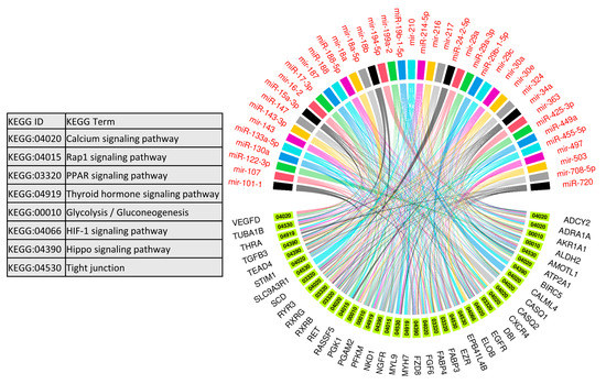 We used 47 upregulated miRNAs and their 326 downregulated target genes (Table S2) for gene ontology and KEGG pathway enrichment analysis using the ClueGO (version 2.5.1) and Cluepedia (version 1.5.7) plugin in Cytoscape (version.3.8.2) environment [48,49,50]. The results of gene ontology enrichment analysis showed that the downregulated genes significantly enriched biological processes vital for muscle growth and development, including myoblast fusion, myotube differentiation, and regulation of angiogenesis (Figure 5). The other important enriched biological processes included the regulation of embryonic development, bone remodeling, placental blood vessel development, regulation of multicellular organism growth, and epidermal growth factor receptor signaling pathway (Figure 5). Figure 5 also shows the upregulated miRNAs targeting the genes enriching important biological processes. A complete list of biological processes significantly enriched by downregulated genes is provided in Table S4. Similarly, KEGG pathways enrichment analysis showed that 326 downregulated genes significantly enriched important KEGG pathways including the calcium signaling pathway, Rap1 signaling pathways, PPAR signaling pathway, thyroid hormone signaling pathway, glycolysis/gluconeogenesis, HIF-1 signaling pathway, Hippo signaling pathways, and tight junction (Figure 6). Figure 6 also shows the upregulated miRNAs targeting the genes enriching important KEGG pathways. A complete list of significantly enriched KEGG pathways by downregulated genes is provided in Table S5.
