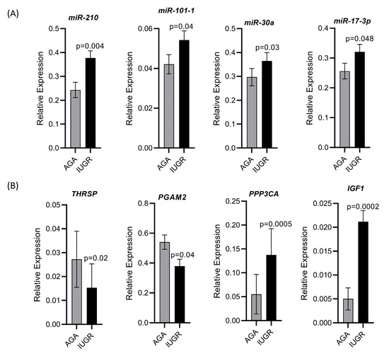 Normal prenatal skeletal muscle growth and development is a major determinant of the postnatal growth and survival and carcass quality of pigs [17,18,19]. The dynamic transition between different cell types during prenatal skeletal muscle development is regulated by numerous signaling pathways and transcription factors, and their dysregulation can lead to abnormal muscle development and reduced muscle mass [54]. We found significantly increased levels of 47 miRNAs in longissimus dorsi muscle (LDM) from IUGR fetuses compared to AGA fetuses at 63 dpc (Figure 2). In recent studies, we investigated the role of miRNAs in pathophysiology of pregnancy-associated disorders and identified potential biomarker miRNAs for pregnancy complications [55,56,57]. Out of 47 upregulated miRNAs reported in this study, dysregulation of five miRNAs including miR-34a, miR-210, miR-199a, miR-363, and miR-16 in placenta or maternal circulation has been previously linked with pathophysiology of IUGR [57,58]. According to our results, from downregulated genes in LDM from IUGR fetuses, miR-34a, miR-210, miR-199a, miR-363, and miR-16 can potentially target 232, 220, 99, 29, and 29 genes, respectively (Table S2). Previous evidence of dysregulation of miR-34a, miR-210, miR-199a, miR-363, and miR-16 in placenta or maternal circulation in IUGR pregnancies, and upregulation of these miRNA in skeletal muscle of IUGR fetuses in our study, indicates the diagnostic and therapeutic importance of these miRNAs.