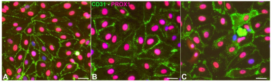 Expression of CD31 (green) and PROX1 (magenta) in HD-LECc5 (A), HD-LECc6 (B), and HD-LECc7 (C). Bar = 15 µm. Pictures were acquired with AxioImager Z.1 (Zeiss, Göttingen, Germany).