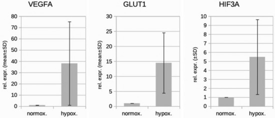Real-time PCR analysis of HD-LECc5, HD-LECc6, and HD-LECc7 under normoxic (21% O2) and hypoxic (1% O2) conditions. Mean values from the three independent LEC donor samples are shown as bars; standard deviation as error bar. Mean values for normoxia were set to 1 to make samples comparable with the 2−ΔΔCT-method. Note the up-regulation of VEGF-A, GLUT1, and HIF3A by hypoxia. Calculations and plot were performed using Microsoft Excel 16 (Microsoft, Redmond, WA, USA).