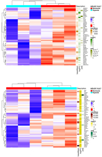 (A) Heatmap of the 50 most up-regulated differentially expressed genes in HD-LECs under hypoxia compared to normoxia. Produced with R version 3.6.3 and package ComplexHeatmap v2.0.0. (www.bioconductor.org/packages/release/bioc/html/ComplexHeatmap.html). (B) Heatmap of the 50 most down-regulated differentially expressed genes in HD-LECs under hypoxia compared to normoxia. Produced with R version 3.6.3 and package ComplexHeatmap v2.0.0. (www.bioconductor.org/packages/release/bioc/html/ComplexHeatmap.html).