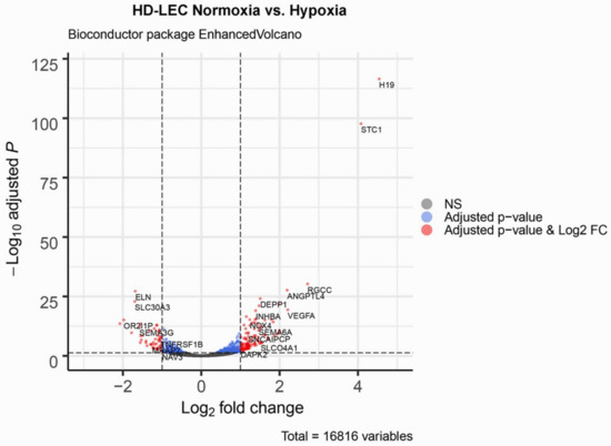 We studied three lymphatic endothelial cell isolates, each of them representing an individual donor. The isolates were designated HD-LECc5, HD-LECc6, and HD-LECc7 (or short: LEC5, LEC6, and LEC7) (Figure 1). Experiments with each isolate were repeated three times, and we always observed the characteristic up-regulation of VEGF-A, GLUT1, and HIF3A (Figure 2). We chose one experiment for RNASeq analysis. Of the 16,816 genes expressed in LECs, approximately 1% were hypoxia-regulated. Thereby, we only listed genes that were consistently and significantly regulated in all three isolates. We observed the regulation of 162 genes (112 up- and 50 down-regulated) including two pseudogenes and 11 long non-coding RNAs (lncRNA). A heatmap is presented for the 50 most highly up-regulated (Figure 3A) and down-regulated genes (Figure 3B). The distribution of significantly regulated genes is shown as a volcano plot (Figure 4). Data show the regulation of characteristic endothelial genes such as VEGF-A, angiopoietin-like 4 (ANGPTL4), and semaphorins (SEMA6A, SEMA3G). The most significantly up- or down-regulated genes are the lncRNA H19 and elastin (ELN), respectively, which are genes that are involved in ECM formation (Figure 4). Among the regulated genes, we also found classical HIF-1 targets such as EGLN3 (Egl-9 Family Hypoxia Inducible Factor 3 = PHD3), which mediates a negative feedback after HIF-induction [21]. Additionally, we observed up-regulation of Solute Carrier Family 2 Member 3 (SLC2A3 = GLUT3), a hypoxia-regulated glucose carrier predominantly found in neurons, which also is a bidirectional transporter of dehydroascorbic acid (vitamin C). Among its multiple functions, vitamin C is an important coenzyme for prolyl-4-hydroxylases and well known for its function in collagen synthesis [22].