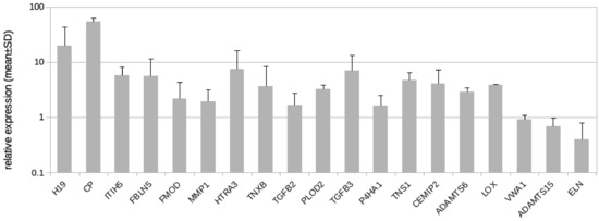The up-regulated procollagen-lysine 2-oxoglutarate 5-dioxygenase 2 (PLOD2; lysyl hydroxylase 2) is a membrane-bound homodimeric enzyme, which catalyzes the hydroxylation of lysyl residues in collagen-like proteins [63]. This post-translational modification of lysin is important for the cross-linking and stabilization of collagen filaments. Mutations in the PLOD2 gene cause the Bruck syndrome, which is characterized by the unusual combination of skeletal changes resembling osteogenesis imperfecta with congenital contractures of the large joints [64].