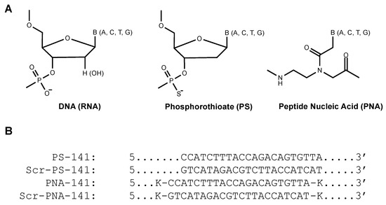 PS are well established to target mRNAs and exert RNase-based activity [33]. Similarly, PNAs have been extensively employed to target numerous miRNAs upregulated in cancers and cardiovascular disorders [34,35]. PNAs exert their mechanism of action by sterically blocking mRNA interaction with ribosomes [36]. Furthermore, PNAs are resistant to enzymatic degradation and exhibit high binding affinity with RNA sequences due to their neutral backbone [37].