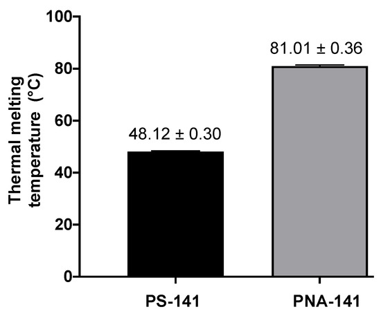 Scrambled PS and PNA oligomers were used as controls (Scr-PS-141, Scr-PNA-141, Figure 1B). Further, to assess the binding affinities, we performed a thermal denaturation experiment with the miR-141-3p target (Figure 2). As expected, we noted higher binding for the PNA-141-miR-141-3p duplex (81 °C) as compared to the PS-141-miR-141-3p duplex (48 °C). These findings were consistent with prior studies that documented the higher binding affinities for PNA duplex due to its neutral backbone. As expected, we did not notice any inflection point (Tm) for Scr-PS-141-miR-141-3p and Scr-PNA-141-miR-141-3p duplexes.