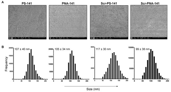 Representative SEM images showing (A) morphology and (B) size distribution curve of PLGA nanoparticles containing PS-141, PNA-141, Scr-PS-141 and Scr-PNA-141. The average particle diameter (nm) and standard deviation are given for NPs in the size distribution curve. The scale bar is 5 to 10 µm.