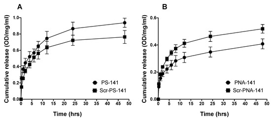 Cumulative release profile data of (A) PS and (B) PNA antimiR-141 and scramble oligomers from PLGA NPs at indicated time points (shown on the X-axis) in a graph. Data are shown as mean ± standard error mean (SEM).