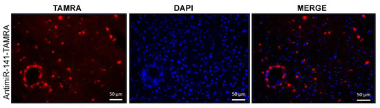 In vivo biodistribution of PS-TAMRA after tail vein injection (48 h after stroke onset) in mice (n = 4) at two days after stroke in the paraformaldehyde fixed tissue of ischemic hemisphere. Blue (nucleus; DAPI), red: antimiR-TAMRA). The scale bar is 50 µM.