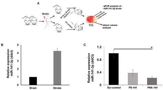 (A) Schematic showing in vivo work flow in mice after ischemic stroke. (B) Relative miR-141 gene expression analysis in RNA isolated from perilesional cortex of ischemic brain tissues and control (sham) samples (n = 3). (C) Relative miR-141 gene expression analysis in RNA isolated from perilesional cortex of ischemic brain tissues after systemic treatment with indicated nanoparticles on x-axis (n = 7, n = 7, and n = 8 in scrambled control, PS-NP and PNA-NP, respectively). PNA-141-3p NPs significantly (* p < 0.05 vs. Scr-NP) reduces miR-141-3p expression levels in brain tissue of socially isolated stroke mice. MiR-141-3p levels were optimally reduced by PS-141-3p NPs. Data are shown as mean ± standard error mean (SEM), Student T test was used for statistical analysis. * p < 0.05.