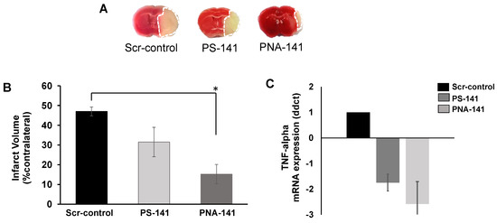 TTC is a widely used dye to measure the viability of the tissue. Dead tissue remains unstained and can be easily measured to determine infarct injury after stroke. We found that after a single tail vein injection (50 µg/kg b.w.) of PNA-141 containing NPs reduced infarct volume significantly (p < 0.05 vs. Scr-control) compared to the scrambled control while PS-141 containing NPs showed a mild but insignificant reduction in infarct volume.
