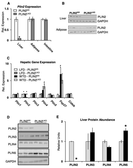PLIN5 protein abundance is significantly increased by liver-specific loss of PLIN2. (A) Gene expression of PLIN2 in tissues from PLIN2fl/fl (white) and PLIN2LKO (grey) mice fed low-fat diet for 12 weeks. n = 8–10/group. (B) Representative blots of PLIN2 protein expression in liver and adipose from mice fed a Western-type diet for 12 weeks. (C) Gene expression in liver of 20-week-old mice following 12 weeks of LFD or WTD treatment. n = 8–13/group. Data are presented as the mean ± SEM. * p ≤ 0.05 vs. LFD–PLIN2fl/fl, # p ≤ 0.05 vs. LFD–PLIN2LKO, and @ p ≤ 0.05 vs. WTD–PLIN2fl/fl, as determined by two-way ANOVA and Tukey’s post hoc analysis. (D) Representative blots and (E) densitometric analysis of PLIN protein abundance in liver following 12 weeks of WTD treatment. Data are presented as the mean ± SEM. * p ≤ 0.05 vs. WTD–PLIN2fl/fl, as determined by student’s t-test.