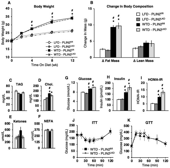 Hepatic PLIN2 loss does not affect body composition, plasma lipids, insulin–glucose homeostasis during LFD or WTD feeding. (A) Body weight over time during 12 weeks of LFD or WTD treatment. Animals began diet at 8 weeks of age. (B) Change in body composition from baseline, as determined by MRI, following 12 weeks of diet treatment. n = 8–13/group. (C) Serum triglyceride, (D) total cholesterol, (E) β -hydroxybutyrate (ketones), and (F) non-esterified fatty acids (NEFA) following a 6 h fast in 20-week-old mice treated with LFD or WTD for 12 weeks. n = 8–10/group. (G) 6 h fasting blood glucose. (H) plasma insulin, and (I) HOMA-IR in 20-week-old mice following 12 weeks of LFD or WTD. n = 10/group. (J) blood glucose response to an intraperitoneal injection of 0.75 IU/kg of insulin (insulin tolerance test, ITT) following a 6 h fast in mice fed LFD or WTD for 16 weeks beginning at 16 weeks of age. n = 8–10/group. (K) Blood glucose response to an intraperitoneal injection 1.5 mg/g of glucose (30% glucose in PBS, glucose tolerance test, GTT) following a 6 h fast in mice fed LFD or WTD for 18 weeks beginning at age 16 week of age. n = 5/group. Data are presented as the mean ± SEM. For A–C: * p ≤ 0.05 vs. LFD–PLIN2fl/fl and # p ≤ 0.05 vs. LFD–PLIN2LKO, as determined by two-way ANOVA and Tukey’s post hoc analysis. For J and K, data were analyzed using students t-test.