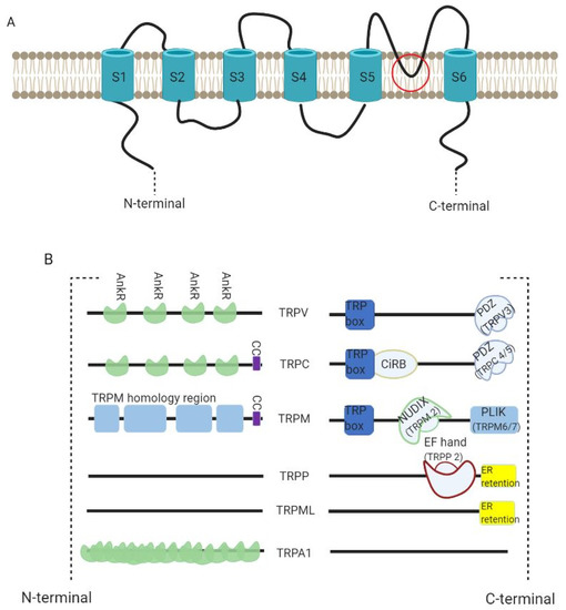 TRP channels are interesting due to the diversity of cation selectivity and specific activation mechanisms. All the channels possess a molecular structure similar to that of voltage-gated K+ channels, with six-transmembrane (S1 to S6) polypeptide subunits (with a pore-forming re-entrant loop between S5 and S6) (Figure 3A). They assemble as tetramers to form cation-permeable pores. Their functions vary strongly according to the intracellular domains (Figure 3B) [41,42].