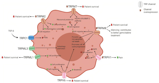 TRPML1 is the founding member of the mucolipins subfamily of TRP. In pancreatic cancer this channel might predict poor survival of the patients with PDAC. In a study with 80 PDAC patients, high levels of TRPML1 are associated with a short overall survival and relapse-free survival compared to the patients with lower levels of the channel. Furthermore, downregulating the expression of TRPLM1 in BxPC-3 and PANC-1 pancreatic cancer cell lines leads to lower proliferation levels. When transfecting PANC-1 cells into the mice, the tumors have significantly less volume when the TRPML1 channel was silenced [99].