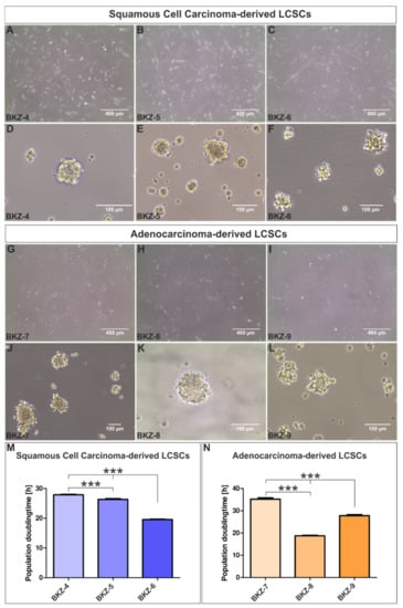 Successful isolation of squamous cell carcinoma (SCC)-derived lung cancer stem cell (LCSC)-like cell populations: (A) BKZ-4, (B) BKZ-5, and (C) BKZ-6. (D–F) Serum-free cultivation of the isolated cell populations led to the formation of free-floating cancer organoids for all three SCC-derived cell populations. Isolated adenocarcinoma (AC)-derived lung cancer stem cell-like cell populations could be also grown as (G–I) adherent culture as well as (J–L) sphere culture. (M) Analysis of the population doubling times of the adherent SCC-LCSCs revealed a higher population doubling time for BKZ-4 in comparison to BKZ-5 and BKZ-6, with BKZ-6 revealing the lowest doubling time. (N) Quantification of the population doubling times for the different AC-LCSC depicted a significantly higher population for BKZ-7 in comparison to BKZ-8 and BKZ-9. Further, population doubling time of BKZ-9 was significantly higher when compared to BKZ-8. Unpaired t-test (p ≤ 0.05). n = 9, *** p ≤ 0.001. Mean ± SEM (standard error of the mean).