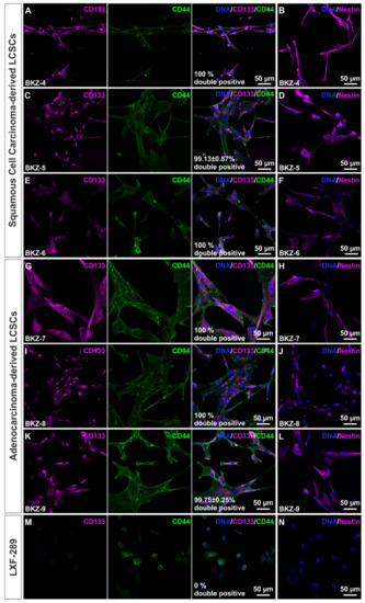 Isolated squamous cell carcinoma-derived and adenocarcinoma-derived lung cancer stem cell-like cells express higher amounts of cancer stem cell markers CD133, CD44, and Nestin in comparison to lung adenocarcinoma-derived cell line LXF-289. Immunocytochemistry revealed the presence of cancer stem cell markers CD133 and CD44 as well as the stem cell marker Nestin on protein level in (A–F) BKZ-4, BKZ-5, and BKZ-6 as well as (G–L) BKZ-7, BKZ-8, and BKZ-9. (M,N) Well-established lung adenocarcinoma-derived cell line LXF-289 did not express CD133 and Nestin and only express CD44 in low amounts in comparison to BKZ populations.