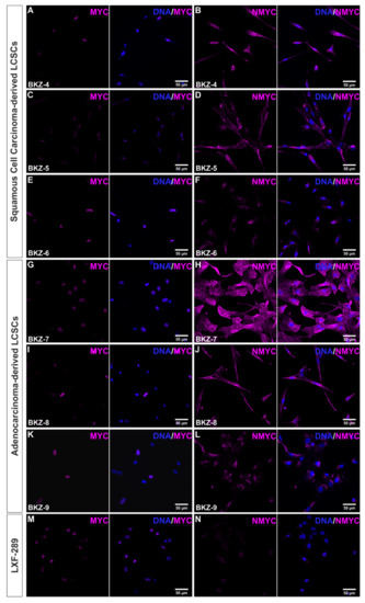 The MYC family members are tightly regulated transcription factors that are responsible for the coordination of cell growth and proliferation and are thus commonly deregulated in a wide range of cancers. Immunocytochemical analysis of MYC showed nuclear localization in BKZ-4 as well as BKZ-6, with BKZ-5 only depicting slight nuclear localized MYC (Figure 4A,C,E). Next to MYC, NMYC protein was robustly expressed in all cell populations, even though expression was predominantly cytoplasmatic (Figure 4B,D,F). Analyzing MYC protein in AC-derived cells depicted nuclear protein expression in BKZ-7 and BKZ-8, but only a slight expression in BKZ-9 (Figure 4G,I,K). Of note, all three AC-cell populations were shown to robustly express mainly cytosolic NMYC (Figure 4H,J,L). Immunocytochemical analysis of the MYC and NMYC expression of the well-established lung adenocarcinoma cell line LXF-289 revealed similar expressions for MYC and a slightly lower amount NMYC in comparison to BKZ populations (Figure 4M–N). Additionally, representative immunocytochemical stainings for MYC and NMYC depicted conserved protein expression in spheroids, as exemplarily shown in BKZ-5-derived spheres (Supplementary Figure S8). Further analysis concerning MYC and NMYC protein levels using Western blot from whole-cell lysates revealed expressions within all BKZ cell populations and LXF-289 cells for MYC and NMYC, respectively (Supplementary Figure S9A). However, BKZ populations revealed additional signals for NMYC in comparison to LXF-289, possibly suggesting the presence of further isoforms of this protein in LCSC-like cells. Additionally, quantification of the relative expression levels revealed higher expression of MYC and NMYC for most of the BKZ populations in comparison to LXF-289 cells, with only BKZ-4 revealing less MYC protein. Still, some BKZ populations at least depicted up to 15-fold NMYC and 2.2-fold MYC expression. In general, NMYC expression levels varied more in AC-derived BKZ populations than in SCC-derived cells, which depicted generally lower level of NMYC. Contrarily, MYC levels varied more in SCC-derived BKZ populations in comparison to AC-derived BKZ populations (Supplementary Figure S9B). Additional investigation of the haploid copy number of MYC and NMYC of all six cell populations revealed a normal copy number (Supplementary Figure S10).