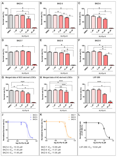 Inhibition of myc proto-oncogene (MYC) and N-myc proto-oncogene (NMYC) protein interaction with Myc-associated factor X significantly decreased survival of squamous cell carcinoma (SCC)- and adenocarcinoma (AC)-derived lung cancer stem cell (LCSC)-like cells. Metabolism was measured using Orangu, and cell count was determined by using a standard curve. Quantification of the normalized survival rate of SCC-derived (A) BKZ-4, (B) BKZ-5, and (C) BKZ-6 showed a significantly decreased survival after exposure to values greater than 5 µM of the MYC/NMYC inhibitor KJ-Pyr-9 in comparison to the control. Calculation of the normalized survival rate for AC-derived (D) BKZ-7, (E) BKZ-8, and (F) BKZ-9 showed a significantly decreased survival after exposure to 20 µM of KJ-Pyr-9 in comparison to the control. However, BKZ-8 and BKZ-9 seemed to be more sensitive in comparison to BKZ-7 as they also revealed a significantly decreased survival after the treatment with 10 µM KJ-Pyr-9. (G) Merged data of SCC-derived LCSC-like cells showed a significantly reduced survival after treatment with KJ-Pyr-9, with values higher than 5 µM for and (J) half maximal inhibitory concentration (IC50) values between 10.33 and 11.48 µM. (H) Quantification of merged data of AC-derived LCSC-like cell populations showed significantly reduced survival upon KJ-Pyr-9 values higher than 10 µM. (K) IC50 values ranged between 10.89 µM and 11.57 µM KJ-Pyr-9 for AC-derived LCSC-like cells. (I) Quantification of the survival of lung adenocarcinoma cell line LXF-289 showed significantly reduced survival after exposure to 10 µM KJ-Pyr-9 with an (L) IC50 of 10.64 µM. Non-parametric Mann–Whitney test (A–G,I, p ≤ 0.05). Unpaired t-test (H, p ≤ 0.05). n = 3, * p ≤ 0.05, ** p ≤ 0.01, *** p ≤ 0.001. Mean ± SEM (standard error of the mean).