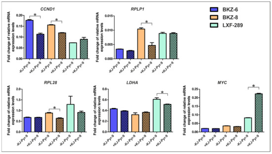 Analysis of potential target genes of MYC involved in the KJ-Pyr-9-induced survival decrease revealed a decrease of cyclin D1 (CCND1) after 24 h treatment with 20 µM KJ-Pyr-9 for BKZ-6 and BKZ-8 as representative cell populations for squamous cell carcinoma- and adenocarcinoma-derived LCSC-like cells. Additionally, BKZ-8 exhibited significantly reduced mRNA expression levels of ribosomal protein lateral stalk subunit P1 (RPLP1) and ribosomal protein L28 (RPL28), both involved in ribosomal biosynthesis. Not regulated in LCSC-like cells but regulated in the lung adenocarcinoma cell line LXF-289 were lactate dehydrogenase A (LDHA) and MYC mRNA expressions, as LDHA was significantly reduced and MYC significantly increased after KJ-Pyr-9 application (Figure 6). Further tested but not regulated MYC target genes were cyclin D3 (CCND3), ribosomal protein L5 (RPL5), and ribosomal protein L14 (RPL14) (Supplementary Figure S12). Additional analysis of the number of senescent cells after treatment with 20 µM KJ-Pyr-9 for 24 h led to a significant increase in SCC-derived senescent cells, but not in AC-derived senescent cells (Supplementary Figure S13).