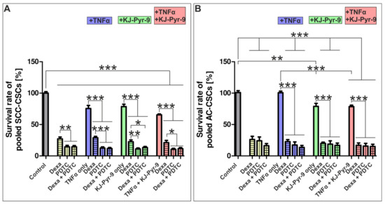Analysis of the influence of TNF-α (10 ng/mL) on NSCLC-derived LCSC-like cells exhibited a survival-decreasing effect only on SCC-derived LCSC-like cells (75.51% (±4.92) survival), but no effect for AC-derived cells. Nevertheless, no synergistic depletion of cellular survival of NSCLC-derived LCSC-like cells was detectable by co-treatments using TNF-α with dexamethasone and/or PDTC together. Accordingly, combined MYC/NMYC and NF-κB inhibition using 10 µM KJ-Pyr-9 with dexamethasone and/or PDTC did not result in synergistic reductions in survival of NSCLC-derived LCSC-like cells. Of note, MYC/NMYC inhibition using only 10 µM KJ-Pyr-9 alone decreased survival of SCC- and AC-derived LCSC-like cells significantly. The use of TNF-α, KJ-Pyr-9, dexamethasone, and PDTC in parallel did not impair NSCLC-derived LCSC-like cell survival synergistically (Figure 7A,B). In summary, the inhibition of MYC/NMYC signaling using KJ-Pyr-9 as well as the inhibition of NF-κB signaling utilizing dexamethasone or PDTC significantly reduced survival of SCC- and AC-derived LCSC-like cells with no synergistic effects (Table 2).