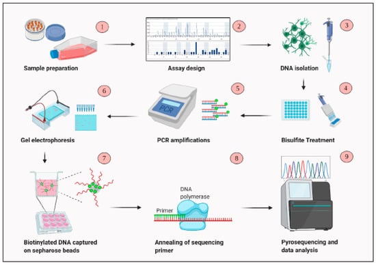 An overview of the steps involved in DNA methylation analysis using pyrosequencing.