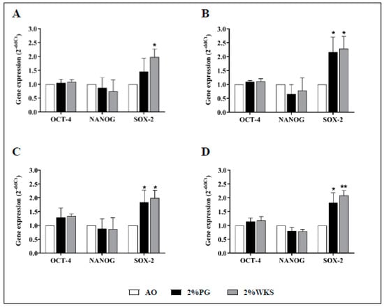 Physoxia increased approximate 2-fold expression of the SOX-2 (vs. AO) pluripotency marker, but no significant differences were noted for OCT-4 or NANOG gene expression. Relative SOX-2 gene expression levels were increased in 2%WKS (vs. AO) across three independent BM-hMSCs first passage samples (BMA-16 (1.98 ± 0.29, p < 0.05), BMA-20 (2.29 ± 0.44, p < 0.05), and BMA-25 (1.99 ± 0.28, p < 0.05)), and again in 2%PG cultures (BMA-16 (1.45 ± 0.45), BMA-20 (2.17 ± 0.54, p < 0.05), and BMA-25 (1.84 ± 0.44, p < 0.05)) (Figure 2).