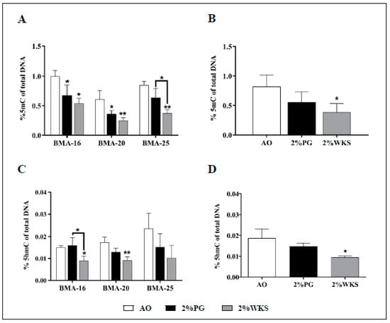 Significant decreases were also noted in the global 5hmC DNA level for BMA-16 (0.009% ± 0.002, p < 0.05) cultured in 2%WKS in comparison to 2%PG or AO (0.016% ± 0.0036; 0.015% ± 0.0008, respectively). Similar reductions were noted with BMA-20 in 2%WKS (0.009% ± 0.0015, p < 0.01) in comparison to AO (0.017% ± 0.002). No significant differences were noted for BMA-25, but decreased 5hmC was noted generally in reduced oxygen settings vs. AO (Figure 3C). Taken together, BM-MSCs displayed a significant reduction in global 5hmC levels in 2%WKS (0.009% ± 0.0007, p < 0.05) vs. AO (0.019% ± 0.004) (Figure 3D).
