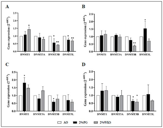 The first passage of BM-MSCs were used for gene expression experiments. Maintenance methylase, DNMT1, expression levels were increased in 2%WKS BMA-16 (1.4-fold, p < 0.05) when compared to AO. No significant changes in expression were noted for de novo methylase DNMT3A. DNMT3B expression was reduced in BMA-16 and -20 (0.43-fold and 0.38-fold, respectively, p < 0.01) cultured in 2%WKS, and BMA-16 and -25 (0.57-fold and 0.6-fold, respectively, p < 0.05) exposed 2%PG condition versus AO. DNMT3L was markedly lower in 2%PG and 2%WKS BMA-16 (0.76-fold, p < 0.01 and 0.69-fold, p < 0.05) in comparison toAO. Furthermore, a decreased expression of DNMT3L in 2%WKS was noted for all (Figure 4). In summary, DNMT3B expression was significantly decreased in both 2%PG and 2%WKS reduced oxygen environment (0.64-fold and 0.59-fold, p < 0.05) when compared to AO, while relative expression changes of DNMT1, DNMT3A, and DNMT3L were not significant.