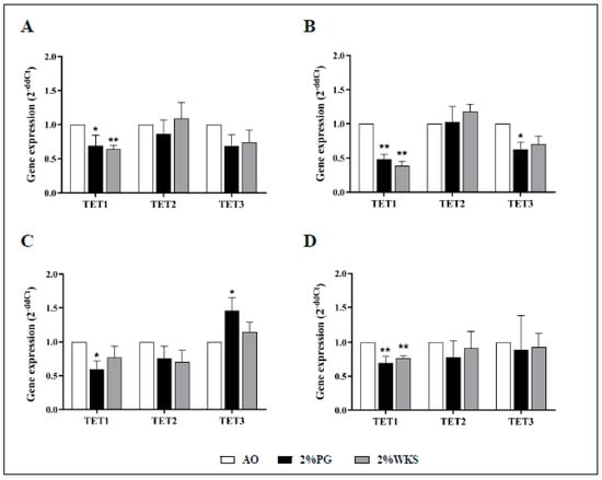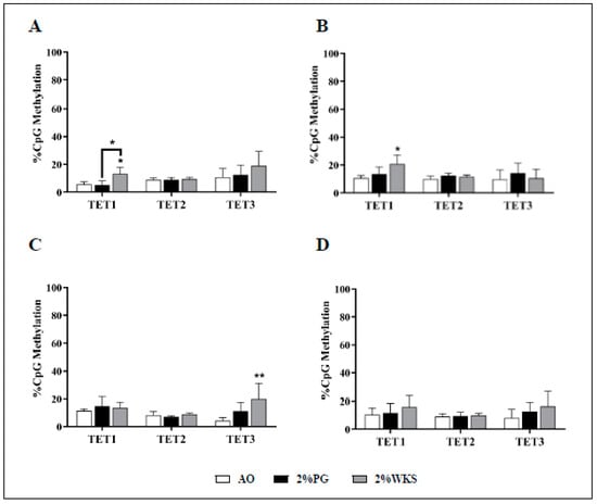In contrast to the above, a more heterogeneous pattern of methylation changes was noted for the TET promoters. We noted a significant increase in methylation of TET1 promoter in 2% WKS BMA-16 (13%) and BMA-20 (20%) versus AO (6% and 11%, respectively). Furthermore, methylation level of TET3 promoter was elevated significantly in 2% WKS (20%) when compared to AO (4%) in BMA-25. However, in general, no significant consensus methylation change for the TETs was noted (Figure 9).