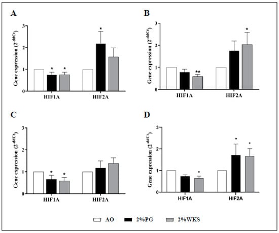 Decreased relative gene expression of HIF1A was noted throughout. BMA-16 in 2%PG (0.76-fold ± 0.11, p < 0.05) and 2%WKS (0.76-fold ± 0.10, p < 0.05) was reduced when compared to those in AO. We noted reduced HIF1A gene expression in BMA-20 under the 2%WKS (0.59-fold ± 0.09, p < 0.01) condition, while BMA-25 in 2%PG (0.66-fold ± 0.18, p < 0.05) and 2%WKS (0.59-fold ± 0.15, p < 0.05) displayed similar levels of reduced expression versus those in AO (Figure 6). In contrast to above, HIF2A expression was significantly elevated in BMA-16 (2.2-fold ± 0.54, p < 0.05) in 2%PG, and BMA-20 in 2%WKS (2.04 ± 0.54, p < 0.05). Combined analysis of all BM-hMSCs indicated a significant increase in HIF2A gene expression (1.71-fold ± 0.51 and 1.67-fold ± 0.34, p < 0.05) in 2%PG and 2% WKS, respectively (Figure 6).