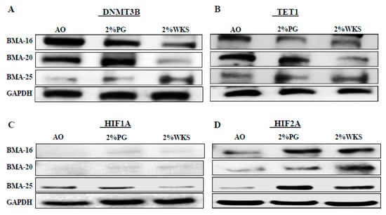 Transcriptional analysis outcomes were subsequently verified via protein analysis. This confirmed that transcriptional downregulation was accompanied by reduced DNMT3B protein levels in the first passage of BM-hMSCs cultured in reduced oxygen conditions (Figure 7). HIF1A protein was undetectable in BMA-16 and BMA-20. No difference in the level of HIF1A protein was apparent in 2%PG and 2%WKS for BMA-25 (Figure 7). Inspection of all BM-hMSCs suggested increased HIF2A protein levels with 2%PG and 2% WKS (Figure 7).