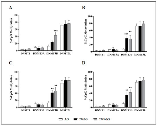 Pyrosequencing was used to determine the methylation of the DNMT3B gene promoter in the first passage of cells. DNMT3B promoter methylation levels were significantly higher in 2%WKS (43%) than in AO (13%) in BMA-16. Similarly, BMA-25 in 2% PG (42%) and 2% WKS (46%) and BMA-20 in 2%PG (38%) and 2%WKS (36%) displayed significant elevation of methylation levels when compared to AO (13% and 7%, respectively). Overall, DNMT3B promoter methylation levels of 34% (2% PG) and 42% (2% WKS) versus 11% (AO) were noted. DNMT1, DNMT3A, and DNMT3L promoter methylation levels displayed no significant change across all three settings (Figure 8).