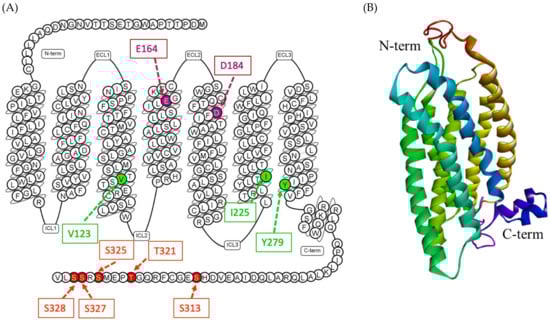 (A) Snake diagram of secondary structure of MRGPRX2 showing N-term, C-term, ECLs and ICLs, retrieved from GPCRdb (https://www.gpcrdb.org/, accessed on 15 April 2021) [90]. The amino acids involved in predicting the binding site of MRGPRX2 are E164 and D184 (pink color); amino acids involved in G protein coupling are V123, I225 and Y279 (green color); and amino acids involved in phosphorylation are S313, T321, S325, S327 and S328 (red color). (B) A predicted 3D homology model of MRGPRX2 showing N-term, C-term and seven transmembrane helix [77].