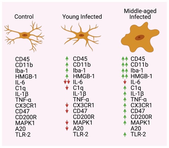In addition, the authors reported an upregulation of mRNA for high mobility group box-1 (HMGB-1) in the brain of young infected mice compared to controls, and a decrease in interleukin (IL)-6 and C1q at day 7. In addition, upon comparing middle-aged infected mice to controls, they found an upregulation of IL-1β and C1q mRNA, and lower levels of IL-6. Most importantly, when comparing young infected mice to middle-aged infected mice, there was an upregulation of mRNA for HMGB-1, tumor necrosis factor (TNF), IL-1β, and C1q within 7 days post-infection in middle-aged mice (Figure 1).