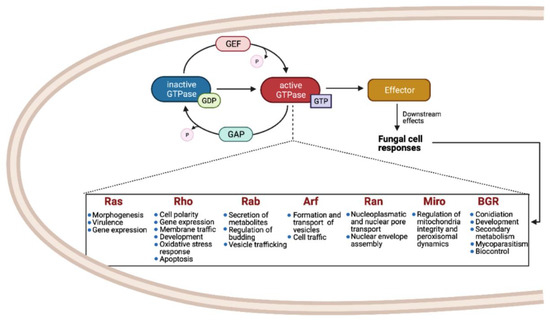Small GTPases of the Ras superfamily regulate several processes in fungi. In fungal cells, GEFs and GAPs catalyze alternation between an active GTP-bound state and an inactive GDP-bound state. Active GTPase interacts with specific downstream effector, leading to different cell responses. The most representative functions of Ras GTPase families are listed in the box.