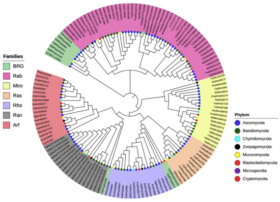In this work, we first focus on analyzing the members of the small Ras GTPase superfamily using genomic data. To find which families of Ras GTPases are present in the fungal kingdom and to search for the relationship between their phylogenetic data and their lifestyles, we first selected 56 genomes of different species distributed in eight different phyla (Figure 2, Table S1). All protein sequences were obtained from “The Fungal Genomics Resource” (MycoCosm. Available online: https://mycocosm.jgi.doe.gov/mycocosm/home, accessed on 14 March 2021) from the Joint Genome Institute (JGI) [20], using three search criteria: (1) PF00071, the Pfam domain key to Ras family, which displays results for the Ras, Rho, Rab, and Ran families; (2) PF00025, ADP ribosylation factor for the members of the Arf family; and (3) PF08477, the Ras complex, Roc, domain of DAPkinase, to find the members of the Miro family. To find the putative Big Ras GTPases, we performed a BLASTP using the sequence of TBRG-1 with each genome analyzed. As shown in Figure 2, the Ras, Rho, Rab, Ran, Arf, Miro, and BRG families are present in fungi, with the Arf family being the most abundant, whereas the Ran family contains the lowest number of members among all species. These patterns of distribution have also been observed in organisms of other kingdoms, such as Arabidopsis thaliana, Oryza sativa, Solanum lycopersicum, Zea mays, Lotus japonicas, Medicago truncatula, Phaseolus vulgaris, and Glycine max from plants; and Homo sapiens and Drosophila melanogaster from animals [21,22,23]. Intriguingly, only few species showed a hit with BRG, Ascomycota being the most represented phylum (magenta labels, Figure 2).