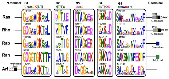Schematic representation of the Ras, Rho, Rab, Ran, and Arf families’ motifs and their biochemical features for their post-translational modifications. The G1 to G5 motifs for each family are within the rectangles and each of the consensus sequences are indicated above. The total of motifs found among the proteins analyzed for each family is shown on top of each motif (number of motifs found/total proteins analyzed). The analysis was carried out on MEME-suite [35]. The amphipathic helix for Arf proteins is indicated at N-terminal as well as their possible myristoylation or acetylation sites. At the C-terminal, the PBR (gray rectangles), the C-residues for palmitoylation in the HVR (black and yellow rectangles with stripes), and the CAAX motif (black rectangles) for Ras and Rho families are indicated, as well as the C-residues motifs (blue rectangles) of Rab and the acidic tail (green rectangle) of Ran proteins are indicated.