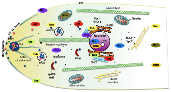 Subcellular localization of Ras, Rho, Rab, Ran, Arf, Miro, and BRG GTPases. The localization of each GTPase depends mainly on its activity. Ras (green ovals) and Rho (purple ovals) proteins are primarily found at ER, cytoplasm, and PM; Rab (light yellow ovals) at ER, vesicles, MVB, or endosomes; Ran (blue ovals) at nucleus and cytoplasm; Arf (red ovals) at ER, Golgi, and cytoplasm; Miro (olive green ovals) at mito-chondria, and BRG (dark yellow ovals) are predicted to be found mainly in the nucleus. Rab, Miro, and BRG could be present at the cytoplasm as well but to a lesser extent. Some examples of specific small Ras GTPases are shown (i.e., Ras, Rsr1p/Bud1p, RasA, Ras1p/2p; Rho, Cdc42, RHO-4; Rab, Sec4, Rab7, Ypt1/6, Ypt7; Arf, Sar1, Arl1; Miro, Gem1p). This figure was drawn according to the literature discussed here as well as by predicting their subcellular localization using WoLF PSORT [57] and COMPARTMENTS [58] programs. The names of each organelle are indicated. Spk: Spitzenkörper; S-ER, R-ER: smooth and rough endoplasmic reticulum; PM: plasma membrane; Nuc: nucleus.