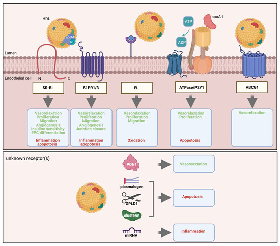Several agonists carried by HDL and receptors involved in transendothelial HDL transport are responsible for the protective functions of HDL on the endothelium (Figure 3). Currently, it is not well understood whether this redundancy reflects parallel activities or interactions of different pathways.