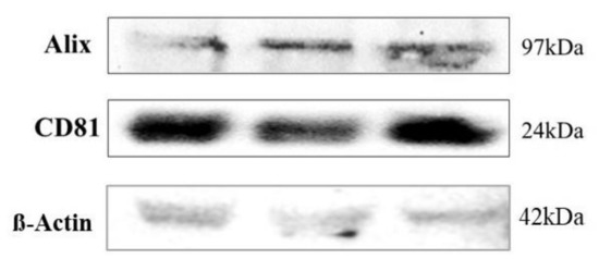 The purity of serum-derived extracellular vesicle preparations was evaluated by western blot analysis, testing for ALIX and CD81 in three random samples (Figure 2). EVs are rich in these two proteins [23].