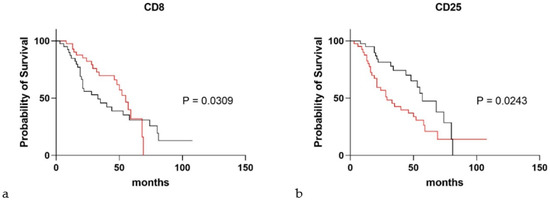 Figure 4 shows the results of Kaplan-Meier survival analysis for IPF patients, stratified according to CD25 and CD8 values. For median values and a cut-off of 0.48 for CD25, the two subgroups showed a significant difference in survival rate (p = 0.0243, hazard ratio: 0.52 (95%CI 0.29–0.92) (Figure 4a); the same was true for CD8 (cut-off 1.53, p = 0.0309, hazard ratio: 1.39 (95%CI 0.75–2.53) (Figure 4b).