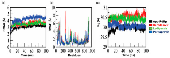 MD simulation results on apo-RdRp and complexes of RdRp with remdesivir, ledipasvir, and paritaprevir. (a) Root mean square deviation (RMSD) of the apo-form of RdRp and the complexes; (b) root mean square fluctuations (RMSFs) of the apo-form of RdRp and the complexes; (c) the radius of gyration (Rg) of the apo-form of RdRp and the complexes.