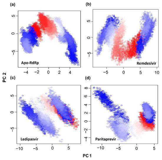 Essential dynamics in a protein are controlled by switching between different conformations, and the phenomena governing this modular nature of the protein are controlled by overall collective motions [53]. This concept is important in many biological processes and plays an important role in biological signaling pathways. In this context, considerable flexibility and rigidity are required for a protein to be functional, especially in a binding site [54,55]. Moreover, a strong interaction may restrict protein movement, thereby affecting its biological activity [56]. Therefore, PCA was carried out to investigate the collective motion of unbound and bound drugs (ledipasvir, remdesivir, and paritaprevir) in the MD trajectories. In this dimensionality reduction method, a projection of two principal components, PC1 and PC2, is calculated by diagonalizing the covariance matrix of eigenvectors to describe the subspace in which maximum protein dynamics occur. Furthermore, by PCA, the MD trajectories of all the protein–ligand complexes and of the apo-protein were examined to evaluate the conformational and structural changes upon ligand binding. The dynamic motions of the protein determined by PCA are depicted in Figure 4. The unbound protein (apo-RdRp) clearly possesses fewer stable clusters compared to the RdRp–drug complexes, particularly in PC2. In the RdRp–drug complexes, a greater number of stable clusters in some protein regions were identified, indicating a reduction in the overall collective motion because the drug binding effectively limits the protein backbone movements in certain regions. The conformational space covered in the case of the ledipasvir and remdesivir complexes proved to be broader than that of the complex with paritaprevir. These results mean that upon ligand binding, the overall conformation of the RdRp protein changes, which may alter the desired protein functionality.